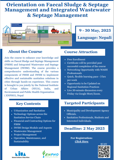 This is an online event jointly with NIUA using the training materials developed by NIUA and translated into Nepali language with the support of ENPHO.